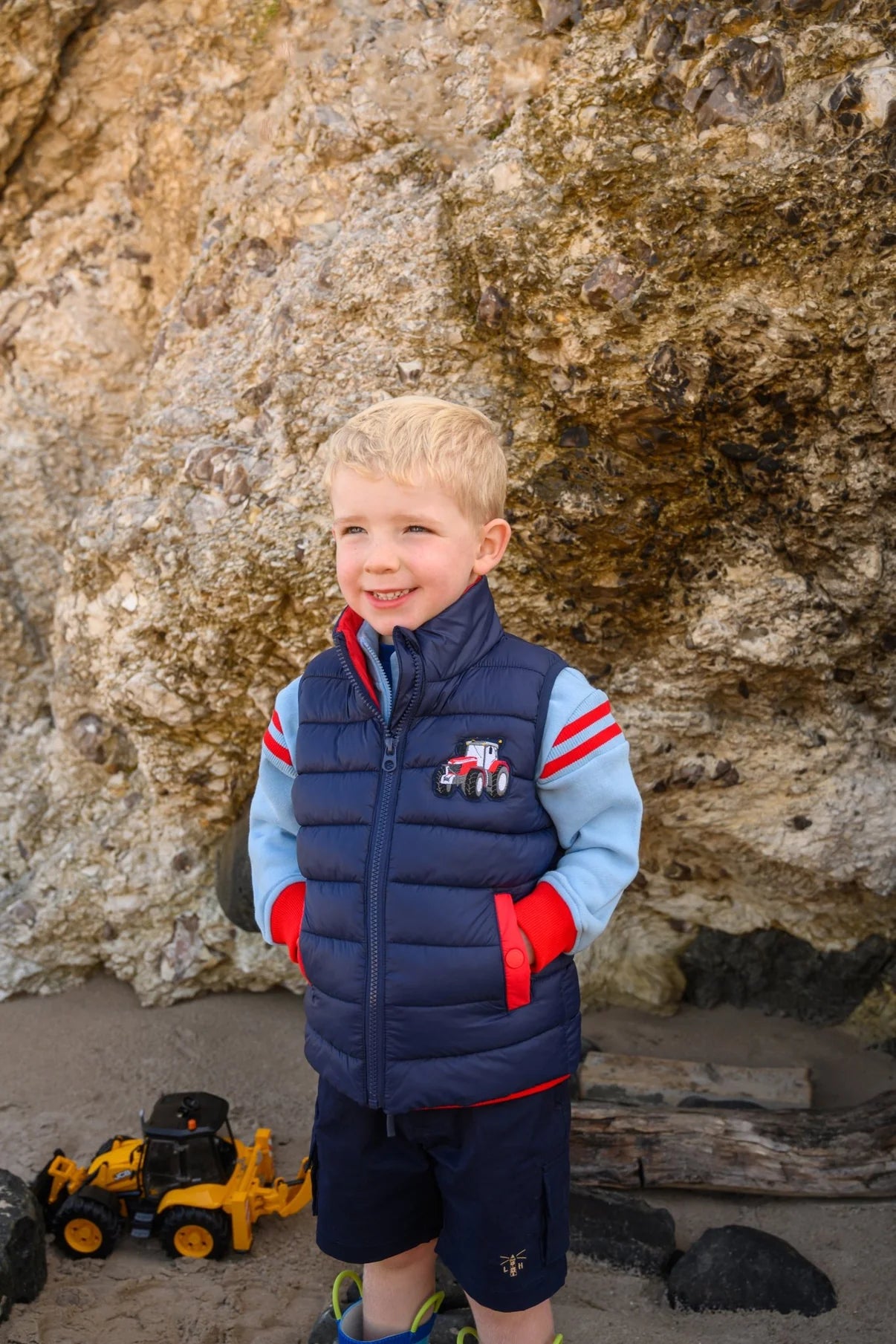 Featuring a navy colour with a contrasting inner lining and tractor motif, this gilet is as practical as it is eye-catching. Two front pockets provide handy storage for essentials or a place to keep little hands warm. Whether it's worn over a cosy hoodie or under a winter coat, this versatile gilet is ideal for year-round wear.